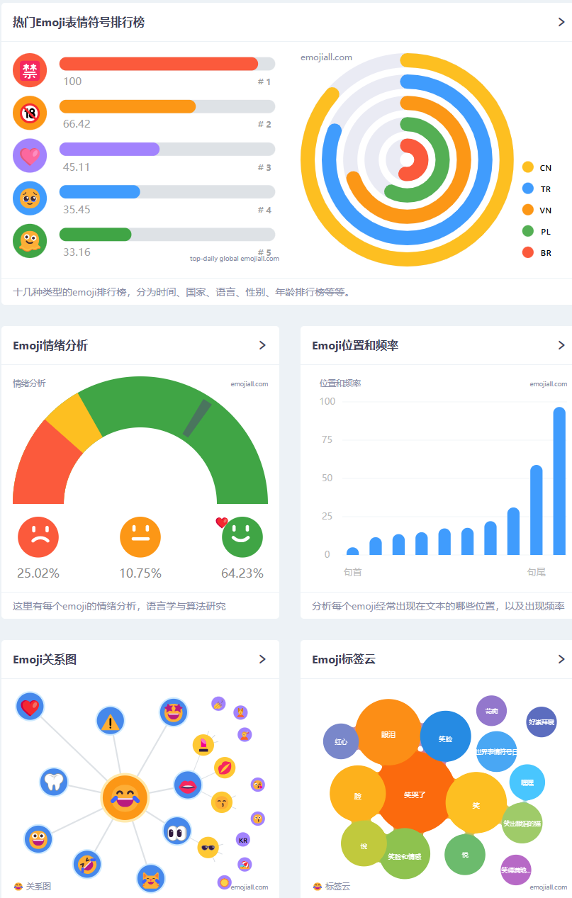 EmojiAll是一个Emoji中文网、全方位在线Emoji表情符号词典平台,该平台是官方Emoji表情符号词典中文网站,提供最新和最全的Emoji搜索及相关信息。用户可查询表情符号含义、使用示例、Unicode代码点及高分辨率图片,并支持一键复制粘贴。平台还提供Emoji大数据排名、矢量图形、动态图表以及智能算法情感分析,辅以表情符号语言学研究,分类清晰,可查看热门表情使用,为用户日常沟通及各领域应用提供权威、丰富的Emoji资源。